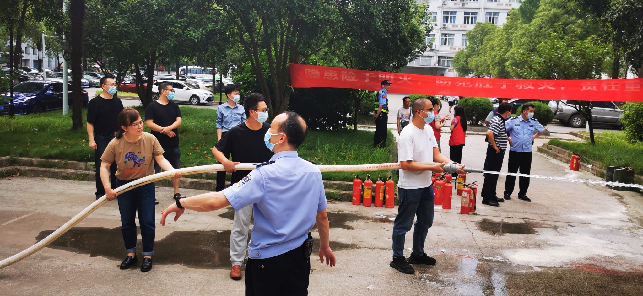 在消防实操演练中,教六楼鸣响火灾警报、各楼层被“烟雾”笼罩。师生在听到警报并发现烟雾后在负责人的指挥和引领下有序疏散至广场。在广场上,程教官展示了灭火器与消防栓的正确用法,并在现场燃起明火让师生们进行灭火演练。