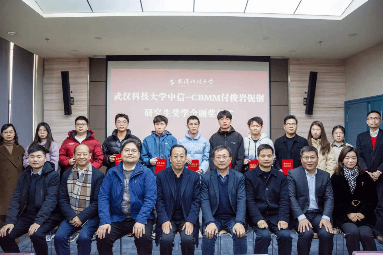 武科大网讯(通讯员何崇喜 沈鑫)12月23日下午,“中信-CBMM付俊岩铌钢”研究生奖学金颁奖仪式暨含铌材料学术报告会于钢铁楼1004报告厅举行。中信金属股份有限公司副总经理、总工程师郭爱民,集团有限公司党委组织部副部长刘凯,股份有限公司高级技术经理张永青、罗毅,副董事长马腾、研究生院经理程常桂、国际钢铁研究院常务副经理吴开明、材料学部副主任张施琦、教授宋新莉出席颁奖仪式。仪式由党委研究生工作部部长郑娟主持。