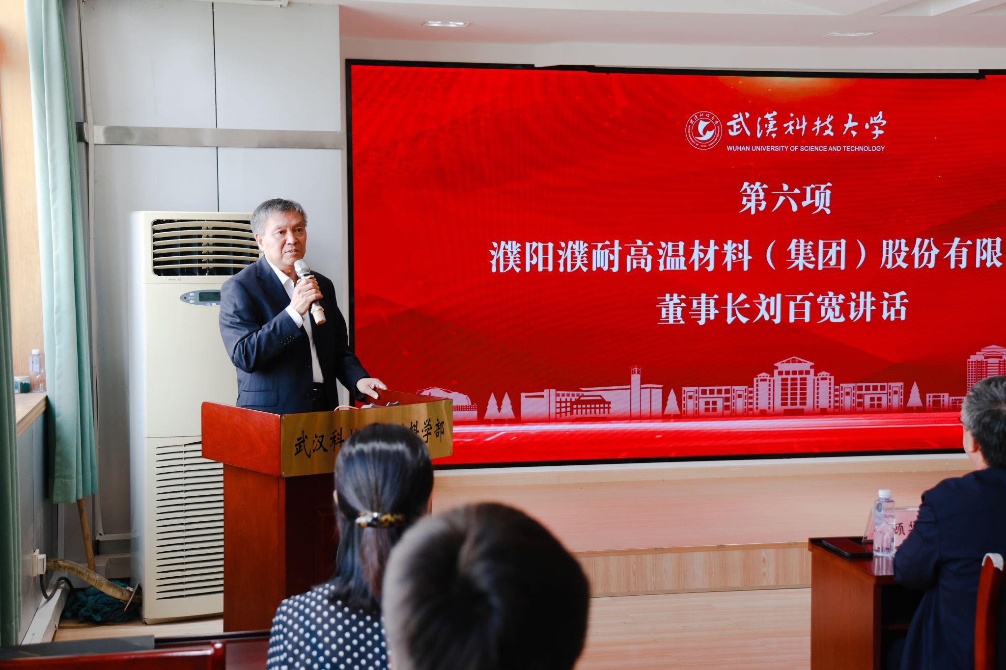 刘百宽在讲话中回顾中国耐火材料行业的发展历程,介绍了耐火材料行业智能化转型趋势与濮耐的企业发展。他指出,在公司材料学部设立“濮耐奖学金”是履行社会责任、回馈母校培养、支持教育事业的重要体现,希望通过这种方式,激励同学们努力学习、勇于创新,将来成为耐火材料行业的栋梁之材。