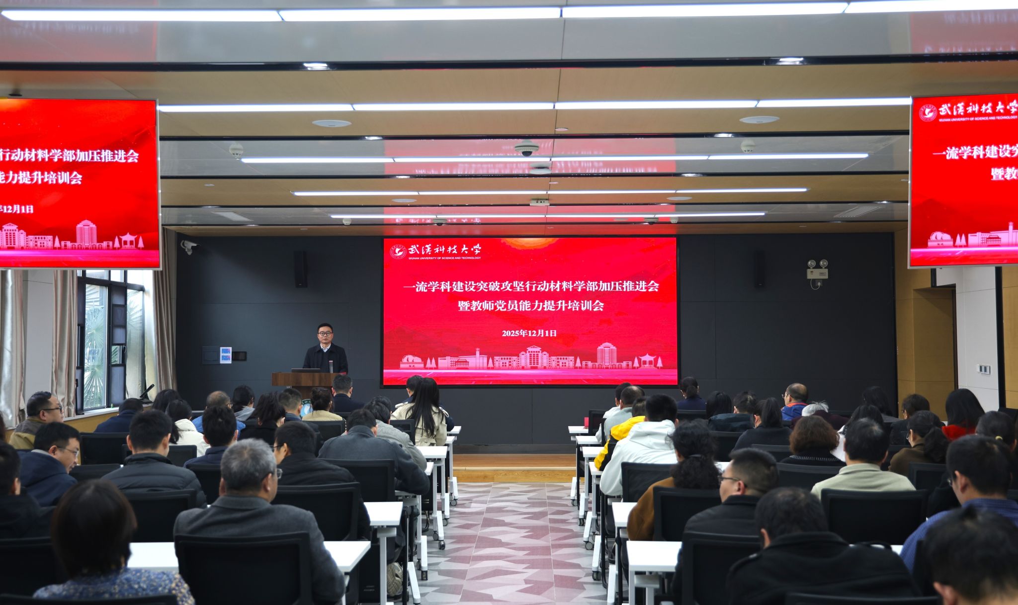 武科大网讯(通讯员 彭九九 叶显伟)12月1日下午,我部在青山校区图书馆路演厅召开“一流团队建设突破攻坚行动加压推进会暨教师党员能力提升培训会”。会议全面贯彻落实湖北省关于推进省属高校“双一流”建设工作和公司一流团队建设领导小组会议精神,系统总结了学部2025年工作成效,全面部署了一流团队建设重点任务,研究谋划了明年的工作安排,同时深入开展党纪党史学习教育。学部执行主任李享成及全体在家领导班子成员出席会议。会议由学部党委书记刘帅主持。