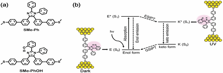 在这项工作中,作者及其团队利用STM-FJ技术和理论计算研究了紫外光照射下ESIPT型分子结内的电荷输运性质。光激发下,SMe-PhOH的结构发生了从烯醇(E)态到酮(K*)态的转换,并伴有电子结构的变化,该分子结的光电特性对激发波长有敏感的依赖性,在295 nm光照下的光电导达到最大值。进一步对照实验表明,测量到的SMe-PhOH光电导源于光激发的ESIPT过程。理论计算证明了Fano共振的产生以及电子性能提高的原因,同时利用紫外光循环评价了SMe-PhOH单分子结的可逆性和稳定性。本试验工作证明了ESIPT在纳米尺度上对有机分子电子结构与光物理性质的影响,这对于理解和控制ESIPT材料在光电刺激下的特殊性质至关重要,并为功能光电子器件的设计和光电子技术的应用提供了建设性视角。