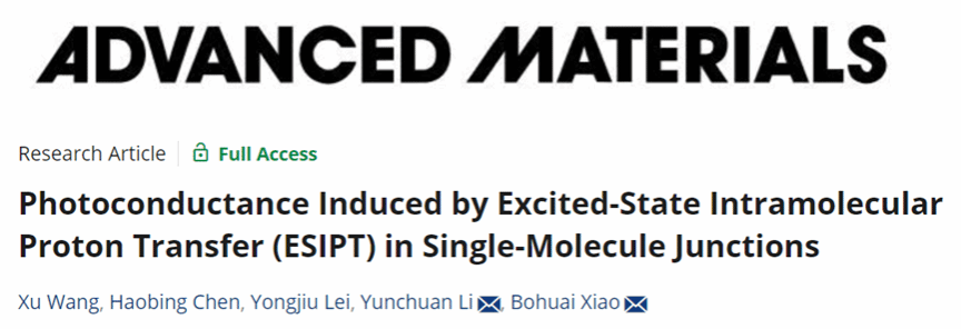 公司材料学部材料化学系,在《Advanced Materials》发表题为“Photoconductance Induced by Excited-State Intramolecular Proton Transfer (ESIPT) in Single-Molecule Junctions”的高水平论文。304永利集团博士研究生王旭为论文第一作者,通讯作者为304永利集团李云川副教授和肖博怀博士,304永利集团为唯一署名单位。